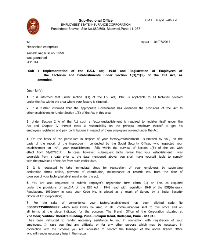Employee State Insurance coverage for workforce welfare.